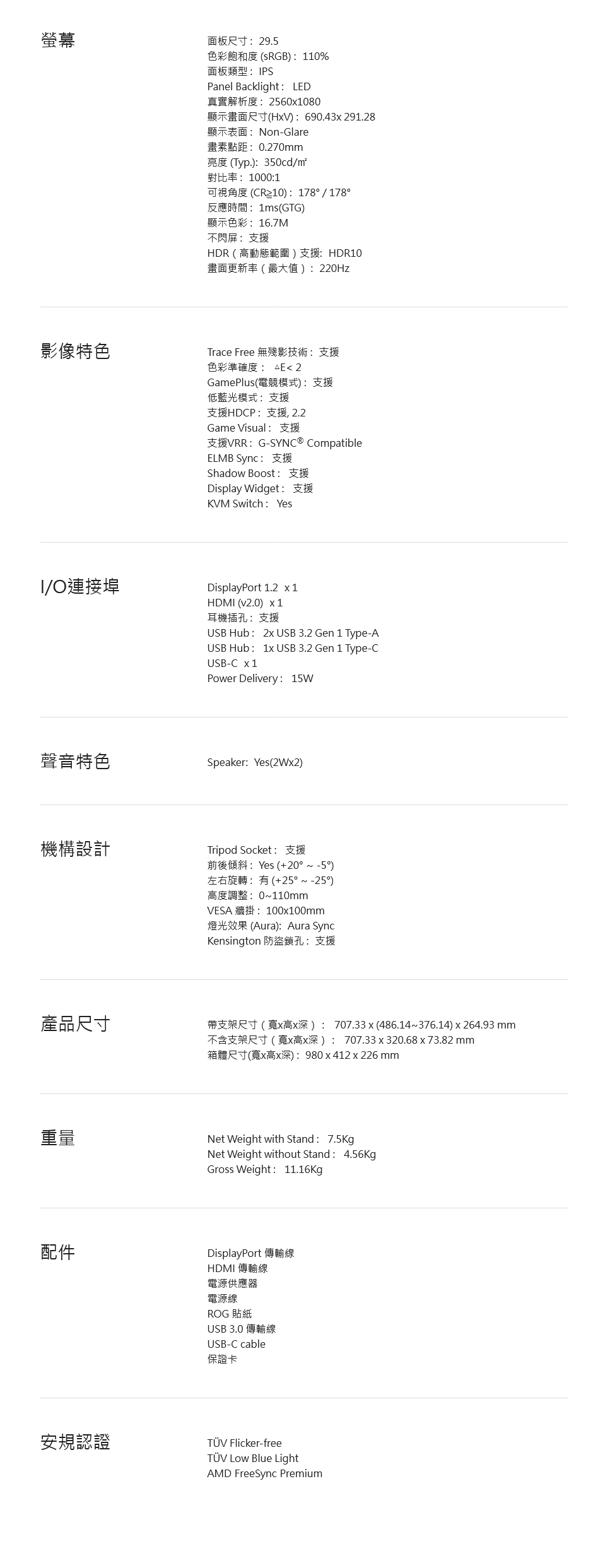 | 特殊功能 | 護眼, 零閃屏, 抗藍光, 電競, 左右旋轉, 廣視角, HDR |